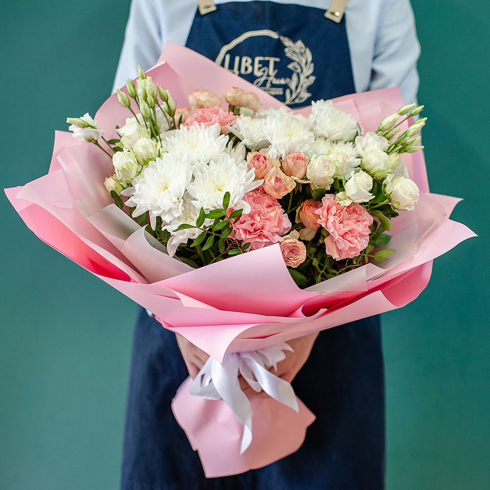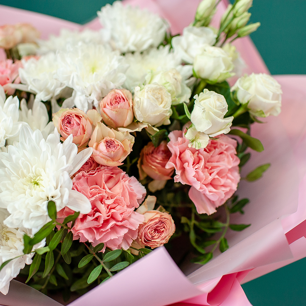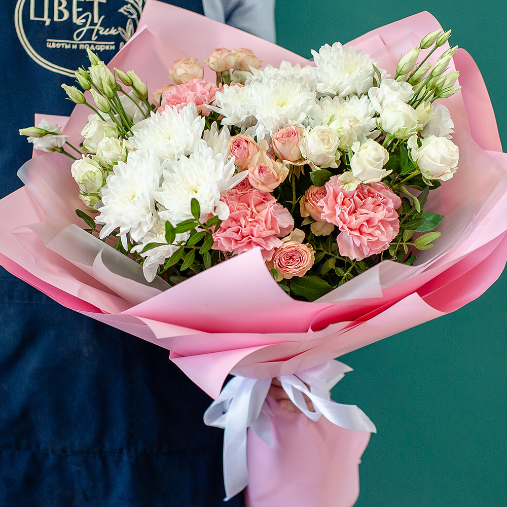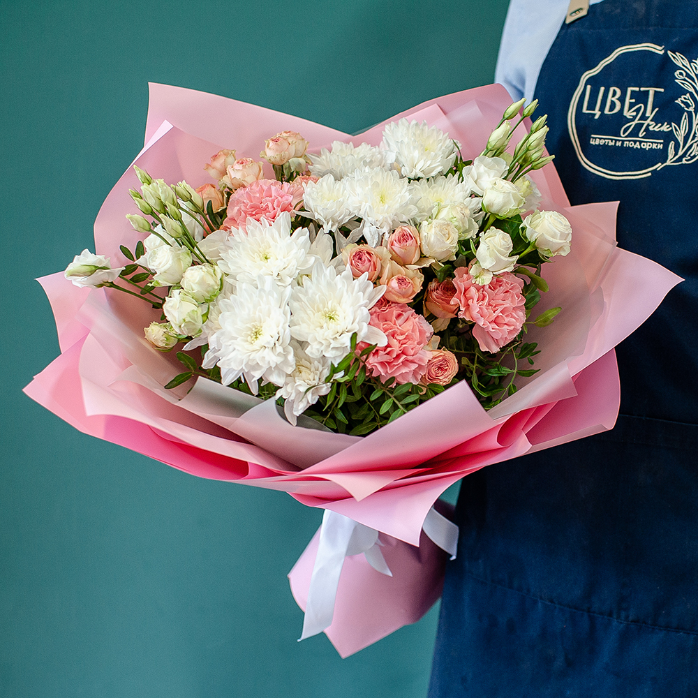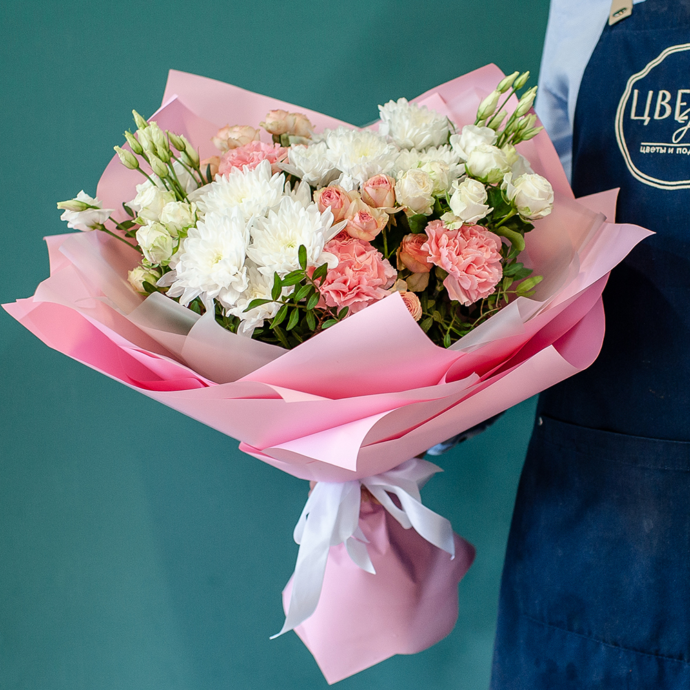 Букет "Нежное чувство" Изысканный букет в нежных пастельных тонах – идеальный подарок для выражения самых теплых чувств. В его состав входят хризантемы, кустовые розы, элегантные эустомы и трогательные гвоздики, гармонично дополненные свежей зеленью. Роскошная упаковка в нежно-розовых оттенках придает композиции особый шарм. Этот букет подойдет для любого случая – будь то день рождения, годовщина, поздравление или просто знак внимания для дорогого человека. Доставка по Рязани от сети магазинов "Цветник" – быстро, удобно и с заботой о ваших чувствах! Доставка по г. Рязань Заказ по телефону или на сайте Оформление в стильной упаковке Подарите радость вместе с цветами от "Цветника"!