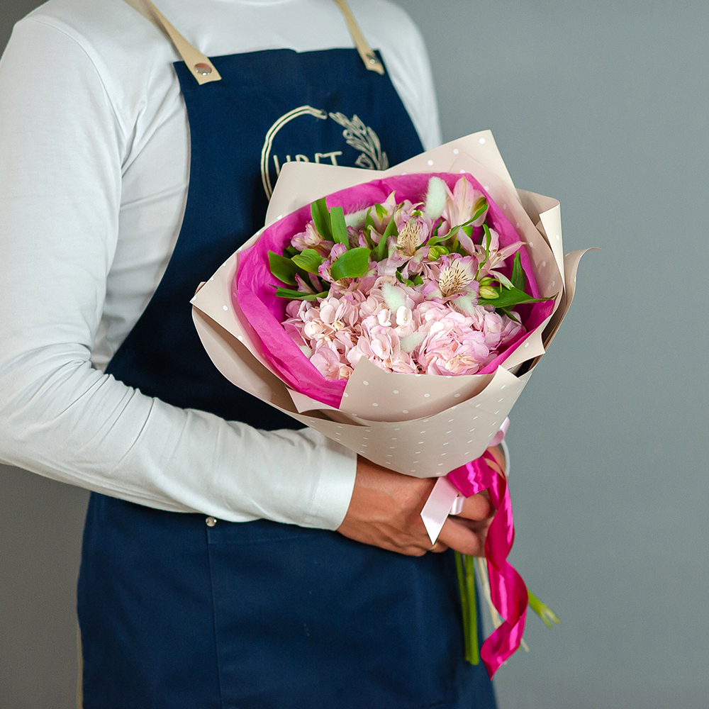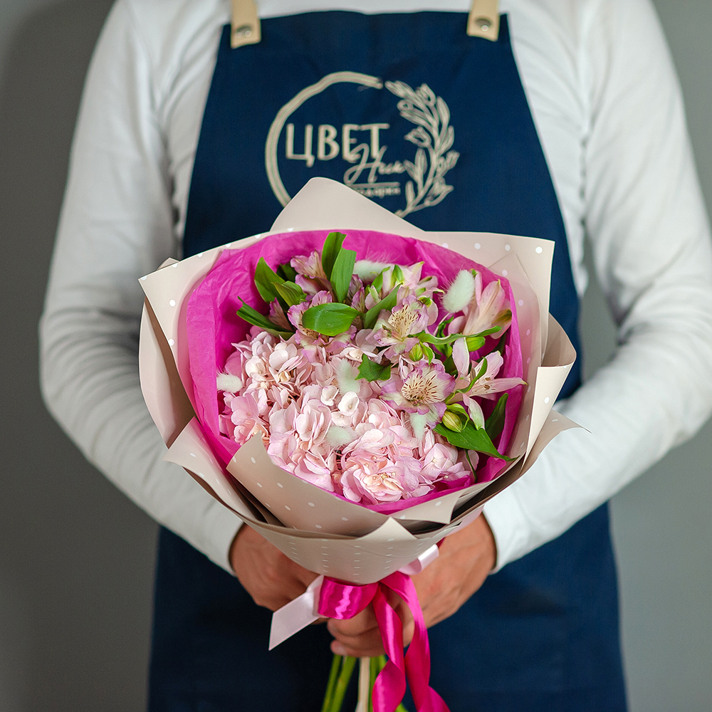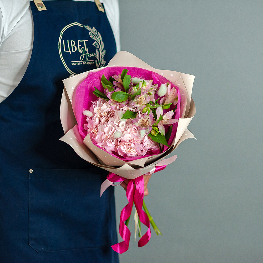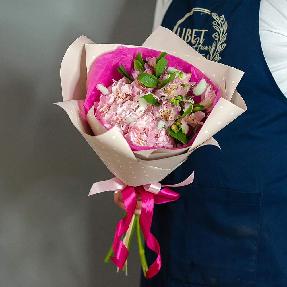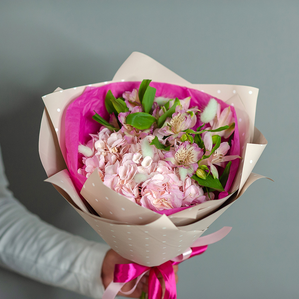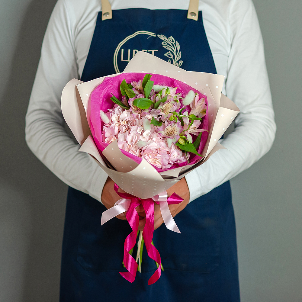 В нем гармонично сочетаются розовая гортензия и альстромерия, которые символизируют любовь, восхищение и благодарность. Эти цветы прекрасно дополняют друг друга, создавая яркий и запоминающийся образ.