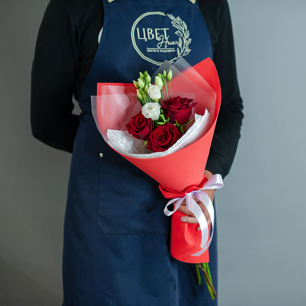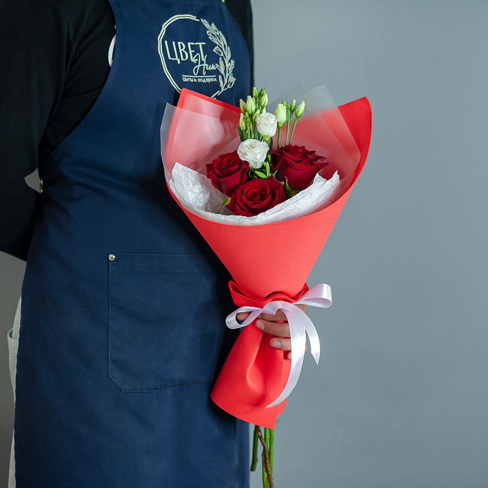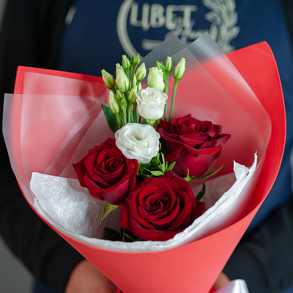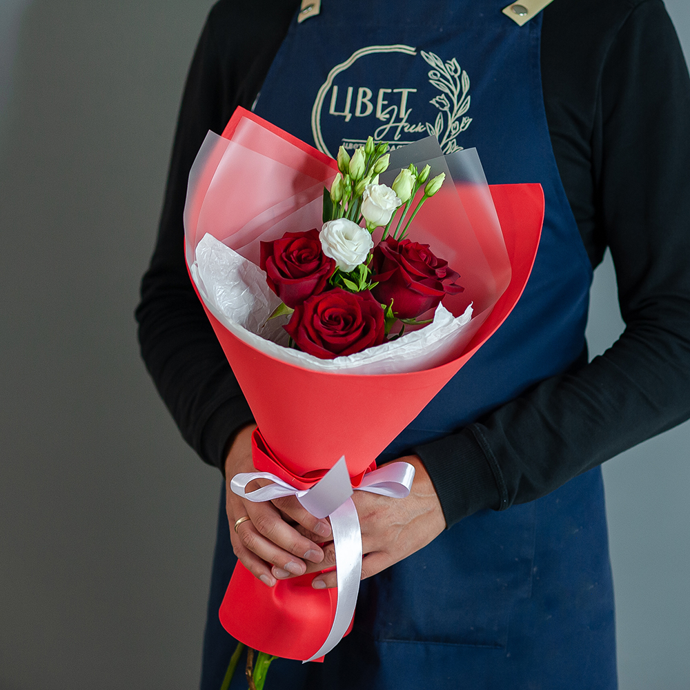 Красные розы символизируют любовь и страсть, а белый лизиантус добавляет букету нежности и изысканности. Миниатюрный размер букета делает его удобным для любого случая: от романтического свидания до корпоративного мероприятия.