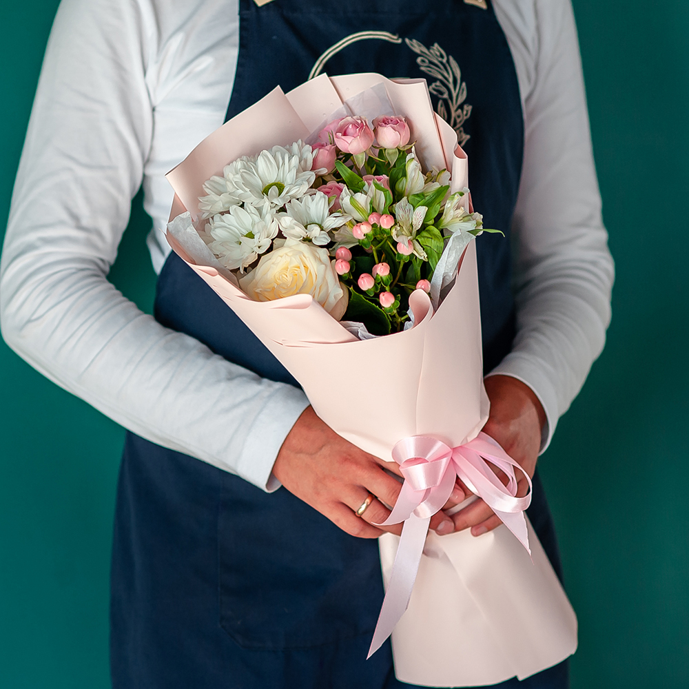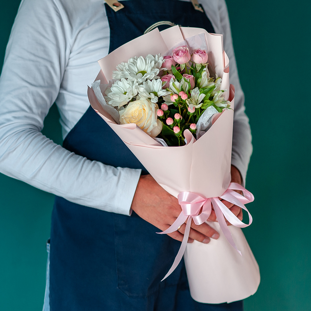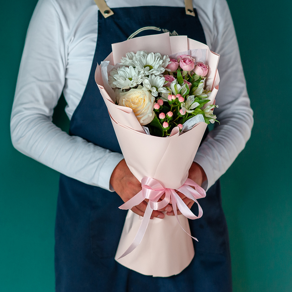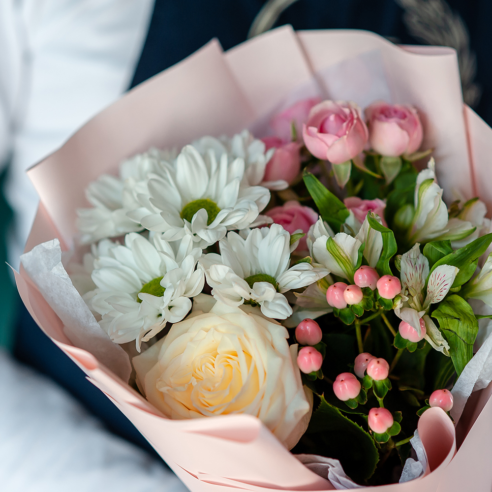 Букет сочетает в себе несколько видов цветов пастельных оттенков, которые создают гармоничную композицию. Нежные тона цветов вызывают чувство умиротворения и спокойствия.