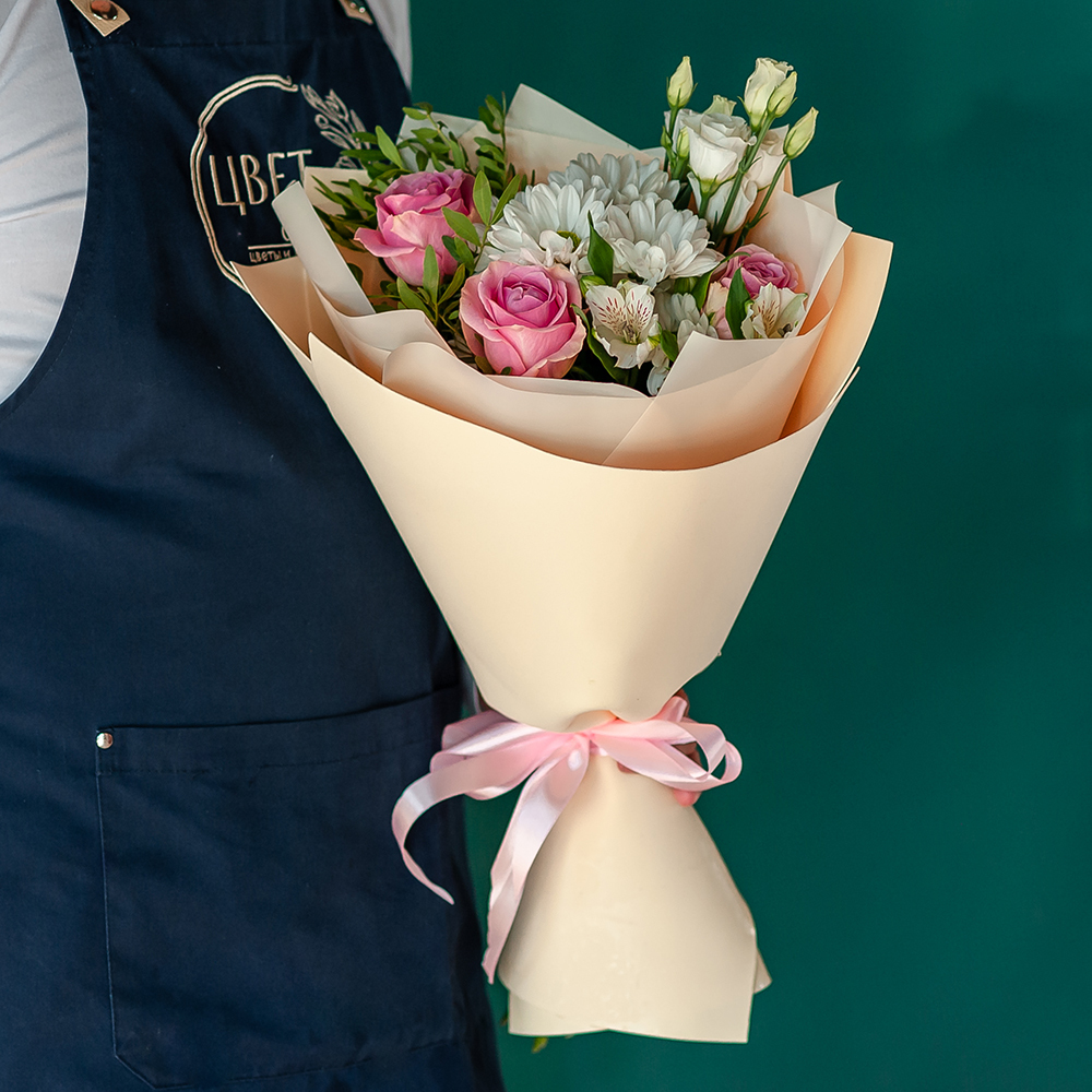 Букет сочетает в себе несколько видов цветов пастельных оттенков, которые создают гармоничную композицию. Нежные тона цветов вызывают чувство умиротворения и спокойствия. Особое оформление букета в персиковых тонах добавляет ему теплоты и уюта.