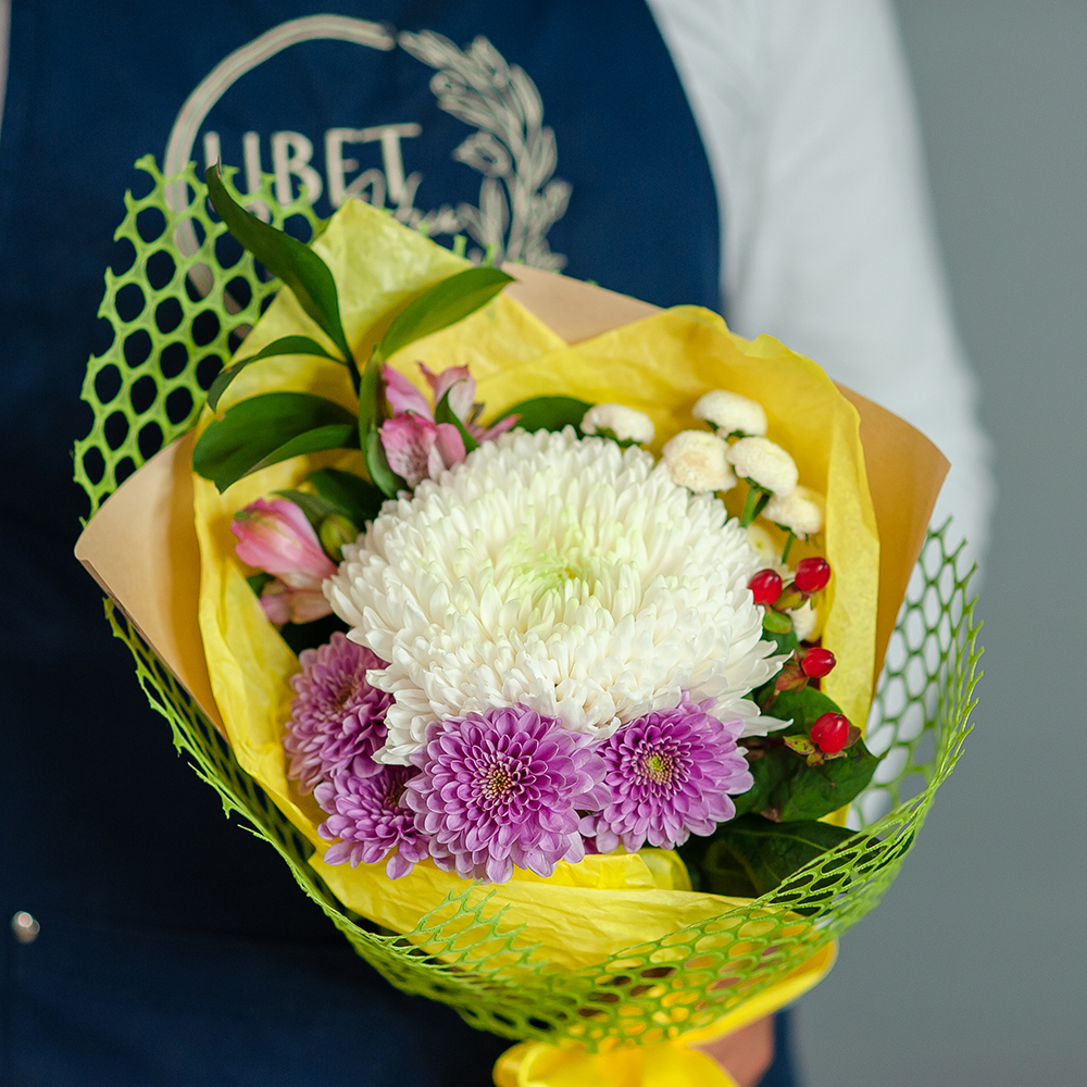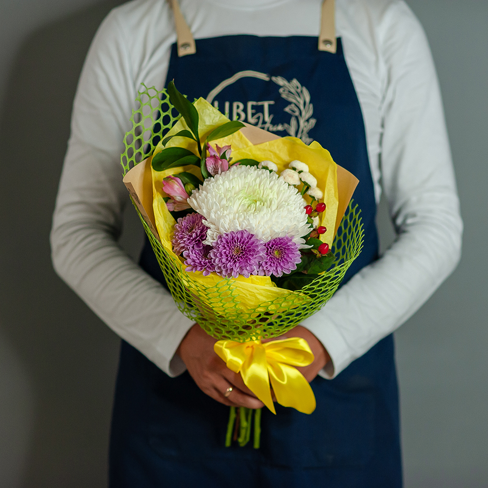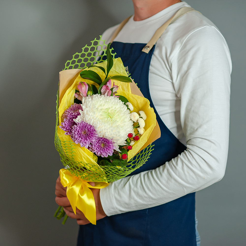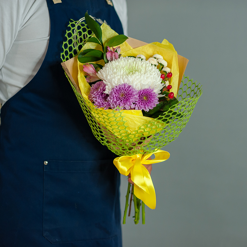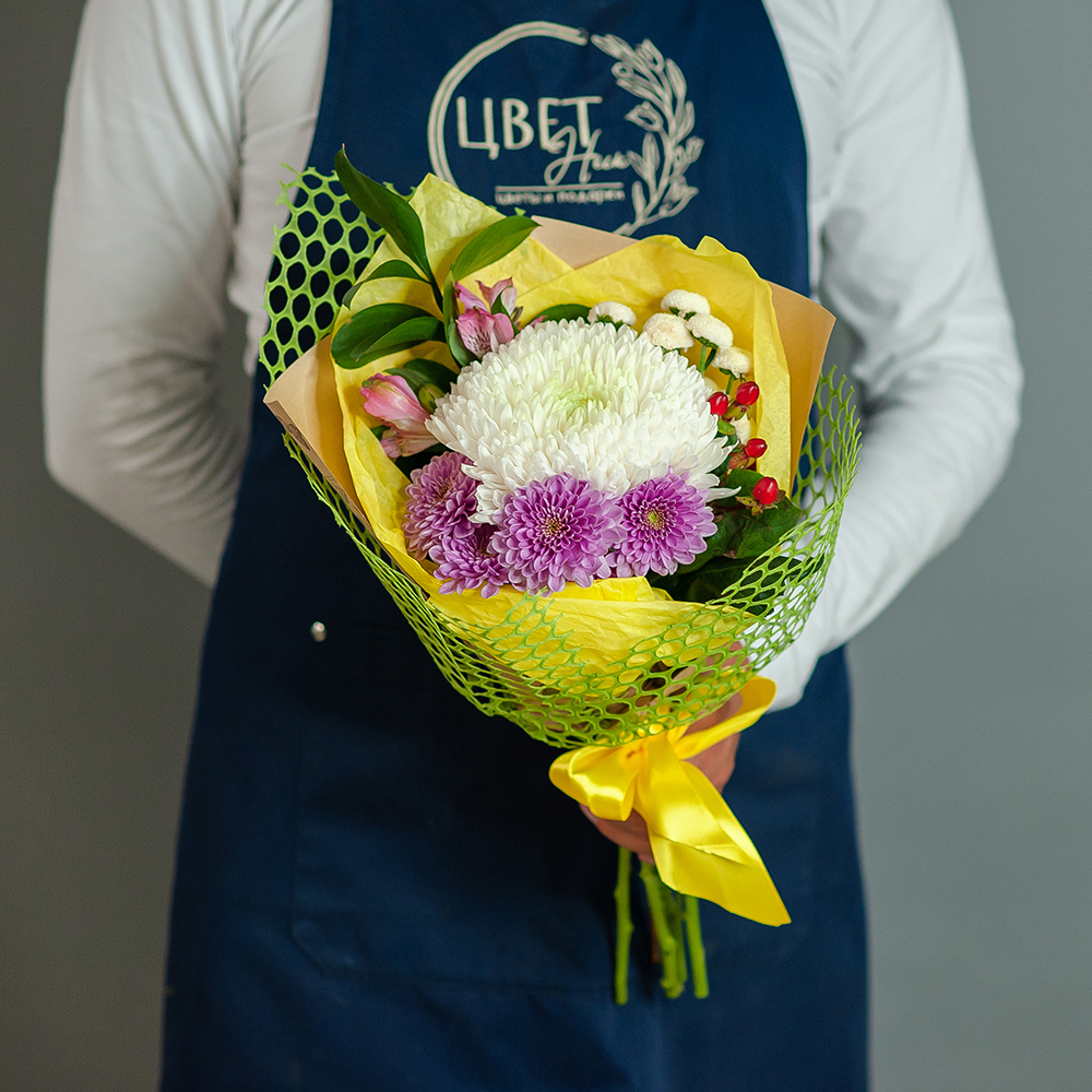 Букет сочетает в себе несколько видов цветов, которые создают неповторимую композицию. Яркие оттенки цветов поднимают настроение и дарят ощущение праздника.