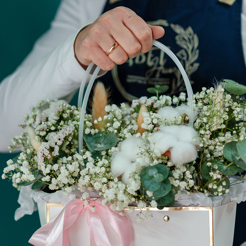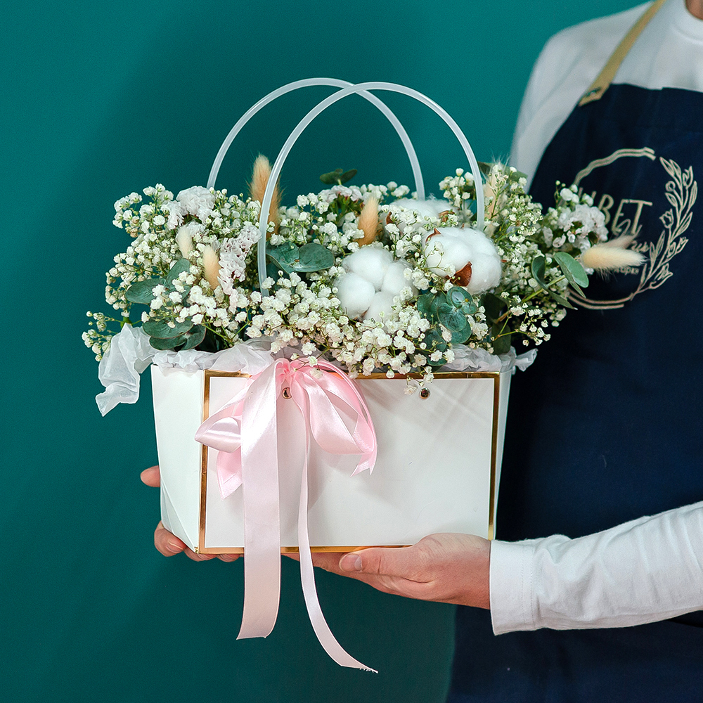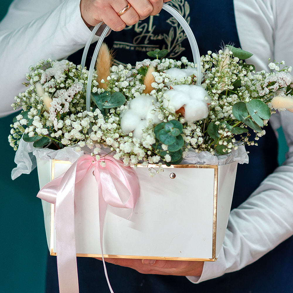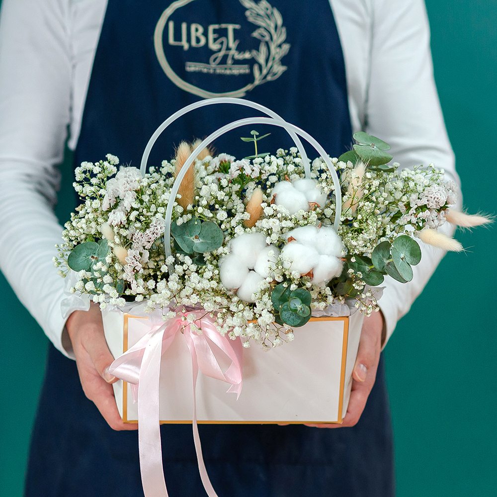 Цветочная композиция в стильной коробке Подарите своим близким атмосферу уюта и тепла с изысканной цветочной композицией. Эта нежная аранжировка из воздушной гипсофилы, хлопка, эвкалипта и декоративных элементов станет прекрасным подарком на любой случай — будь то День рождения, годовщина или просто желание порадовать дорогого человека. Стильный дизайн — цветы оформлены в элегантной коробке с ручками, украшенной атласной лентой. Долговечность — хлопковые соцветия и сухоцветы сохранят свою красоту надолго. Универсальность — подходит для любого события и интерьера. Доставка по Рязани. Возможность индивидуального оформления по вашему пожеланию. Закажите прямо сейчас и порадуйте любимых утонченным подарком!