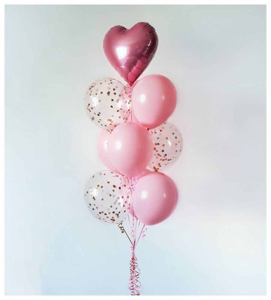 В составе связки: 6 однтотонных шаров, 3 шара с конфетти и 1 фольгированное сердце