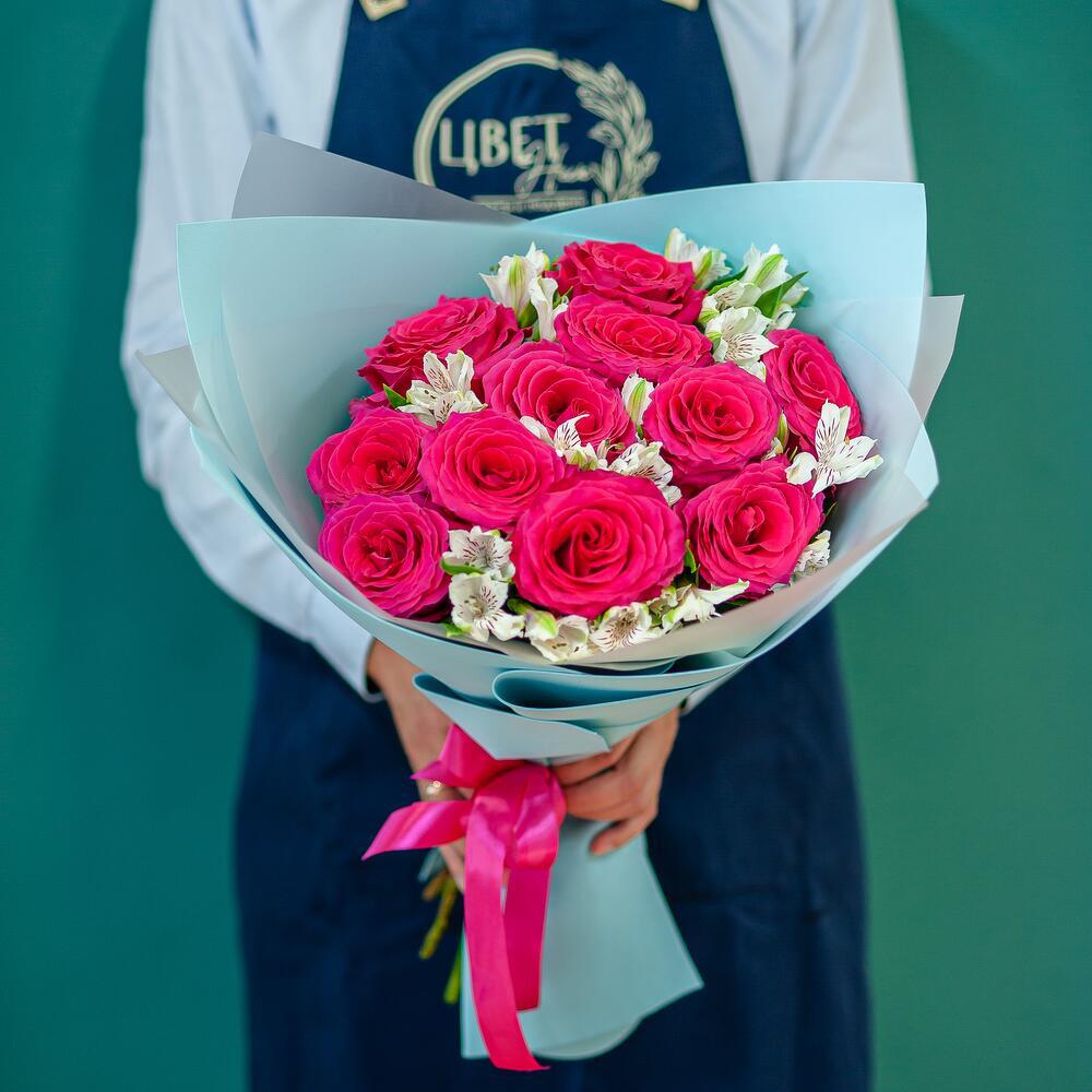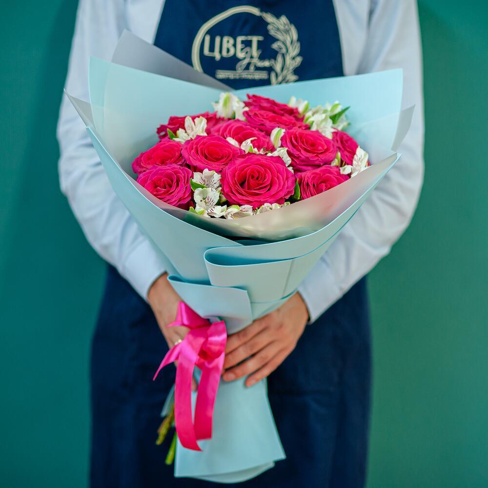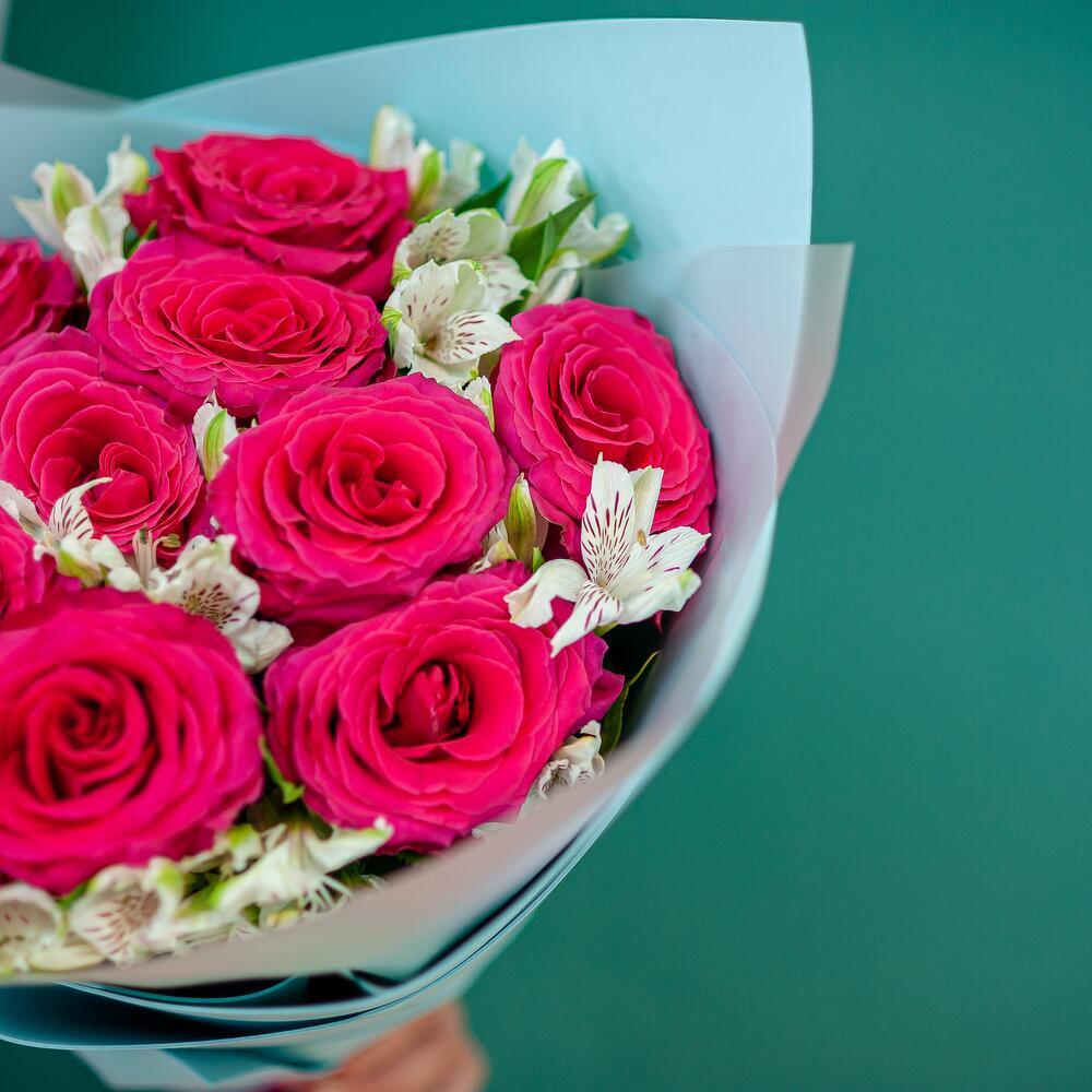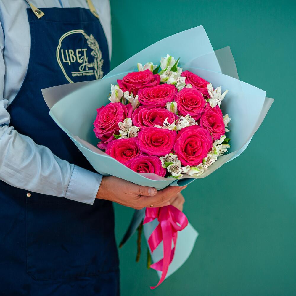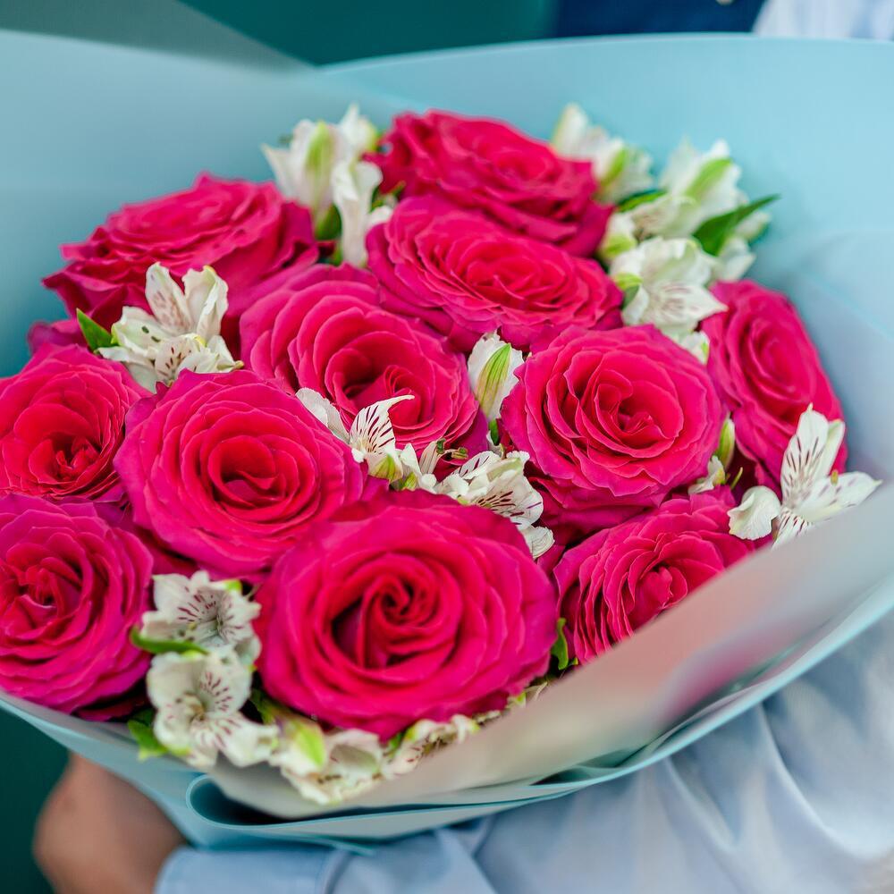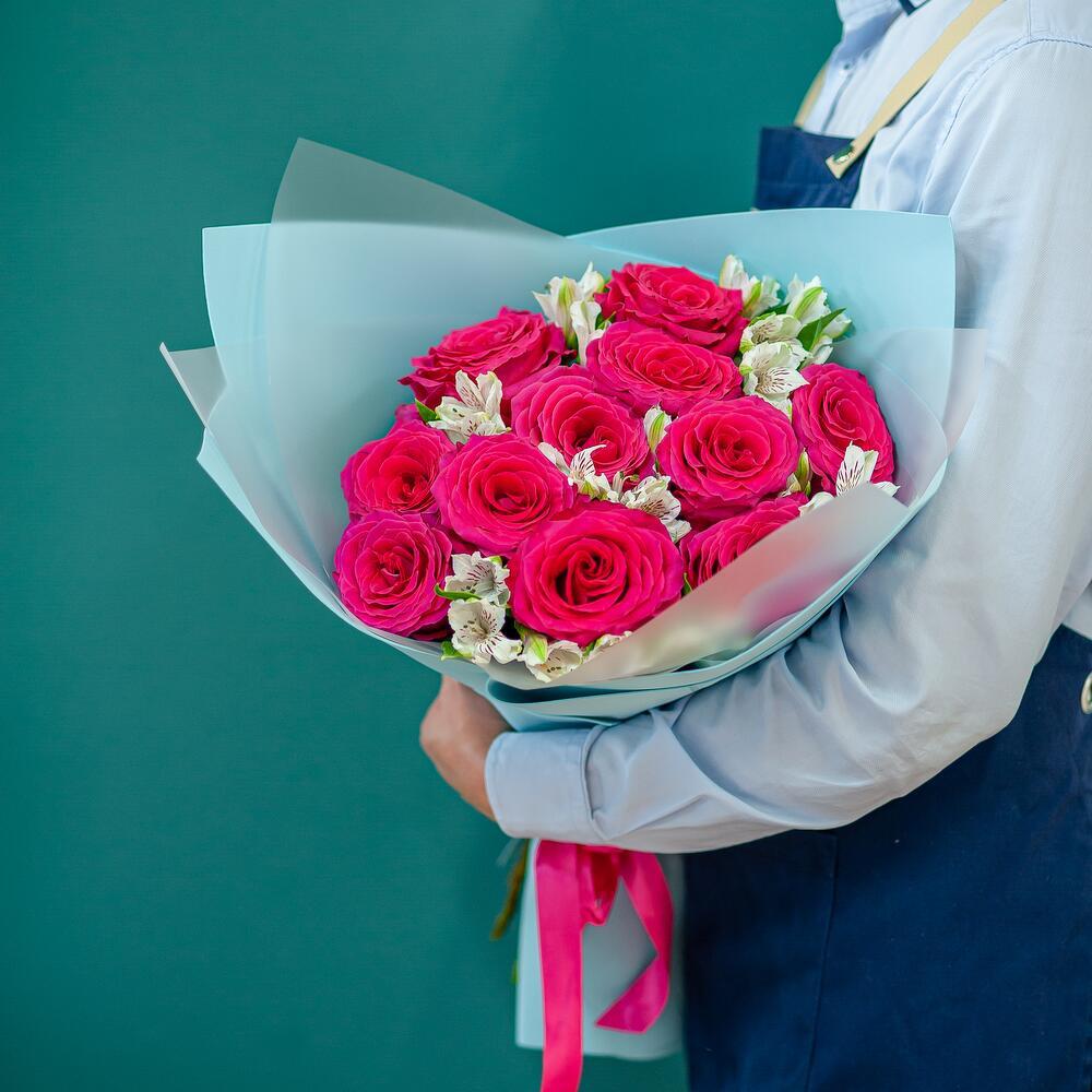 Букет «Розовая нежность» – изысканный подарок для особого случая Роскошный букет из ярко-розовых роз в сочетании с нежными альстромериями – это воплощение красоты, тепла и заботы. Стильная голубая упаковка и атласная лента придают композиции особую элегантность. Состав: - Розы насыщенного розового оттенка - Белоснежные альстромерии - Декоративная зелень - Стильное оформление в крафтовой упаковке Идеально для: - Дня рождения - Юбилея - Романтического свидания - Поздравления без повода Доставка по Рязани от сети магазинов Цветник. Мы гарантируем свежесть цветов и быструю доставку по вашему адресу! Порадуйте близких утонченным букетом, который передаст все ваши чувства!