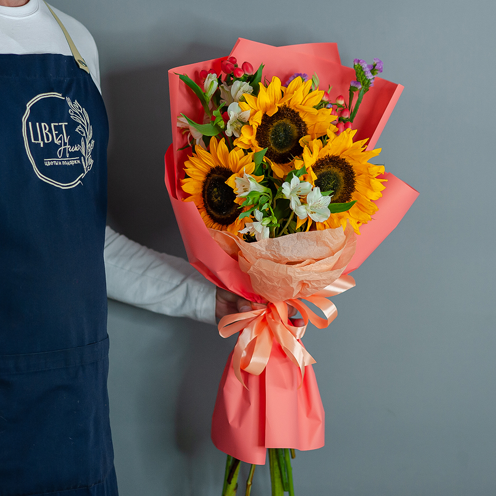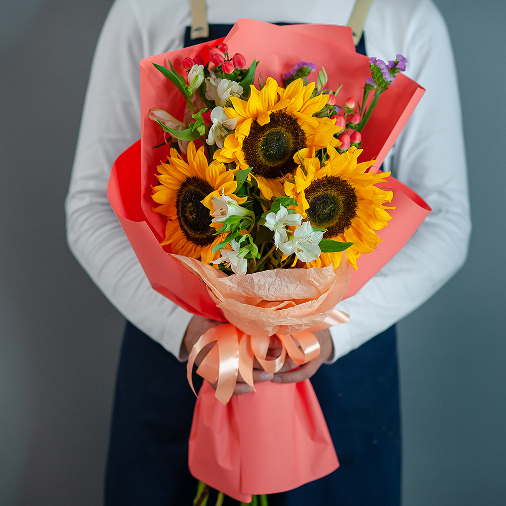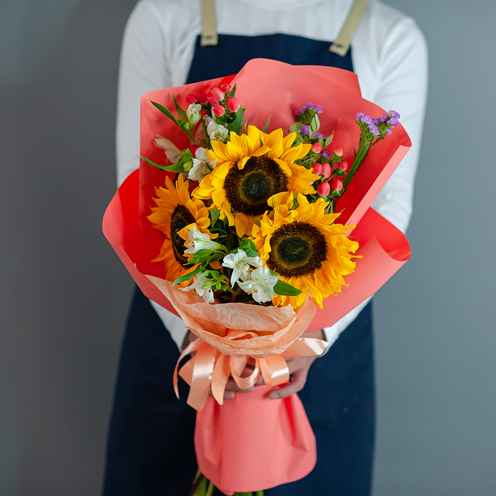 Мы предлагаем вам оригинальный букет из подсолнухов, созданный с любовью и заботой о каждой детали. Наши флористы тщательно отбирают цветы, чтобы создать композицию, которая будет радовать вас своей красотой и свежестью.