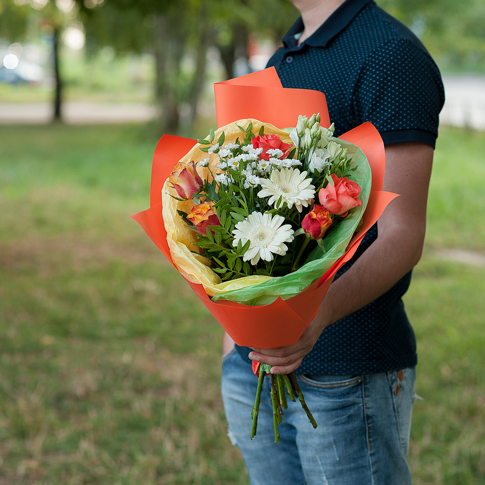 Яркий букет из белых гермини и оранжевых роз — это прекрасный подарок, который подарит получателю солнечное настроение даже в самый пасмурный день.
