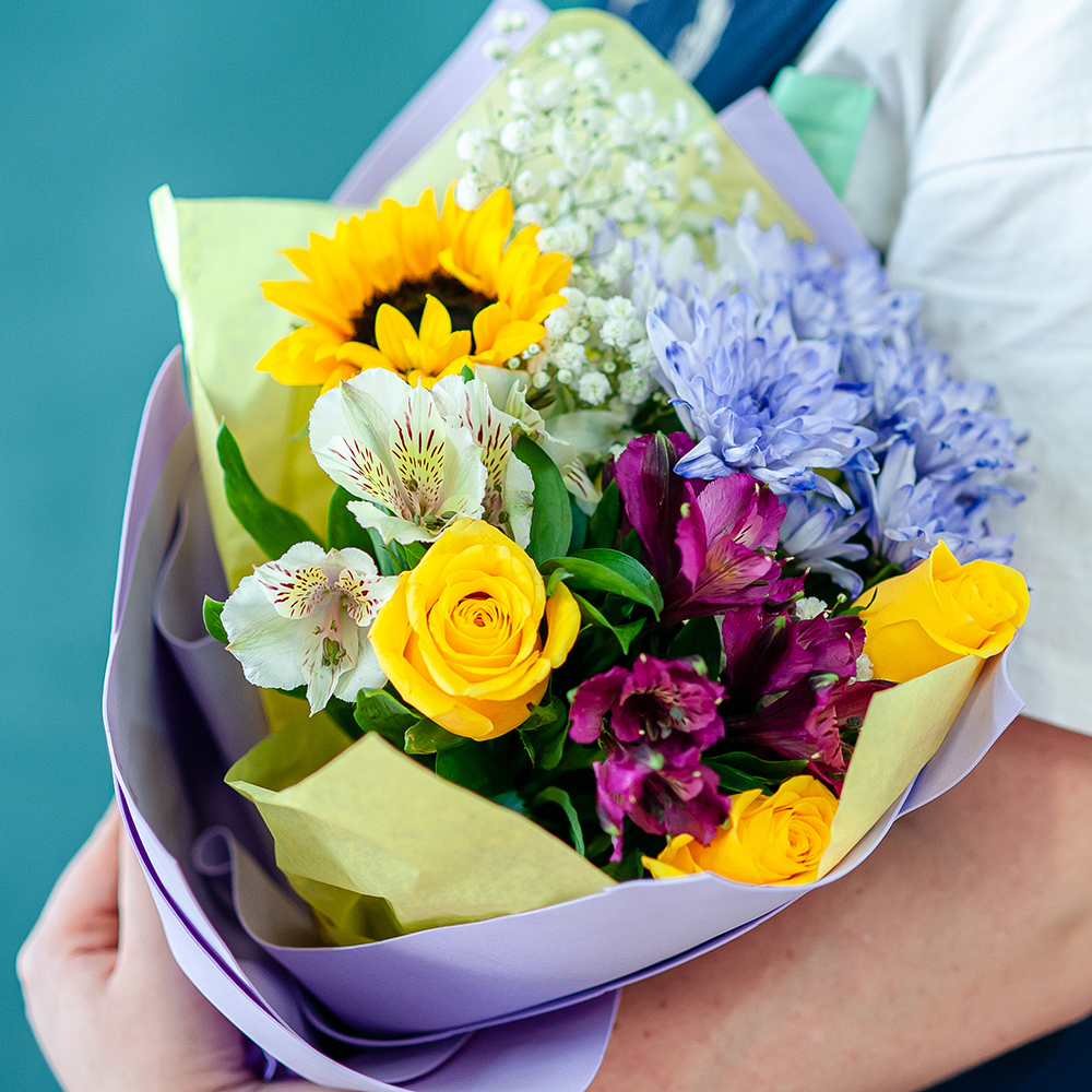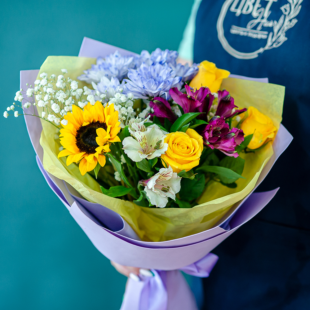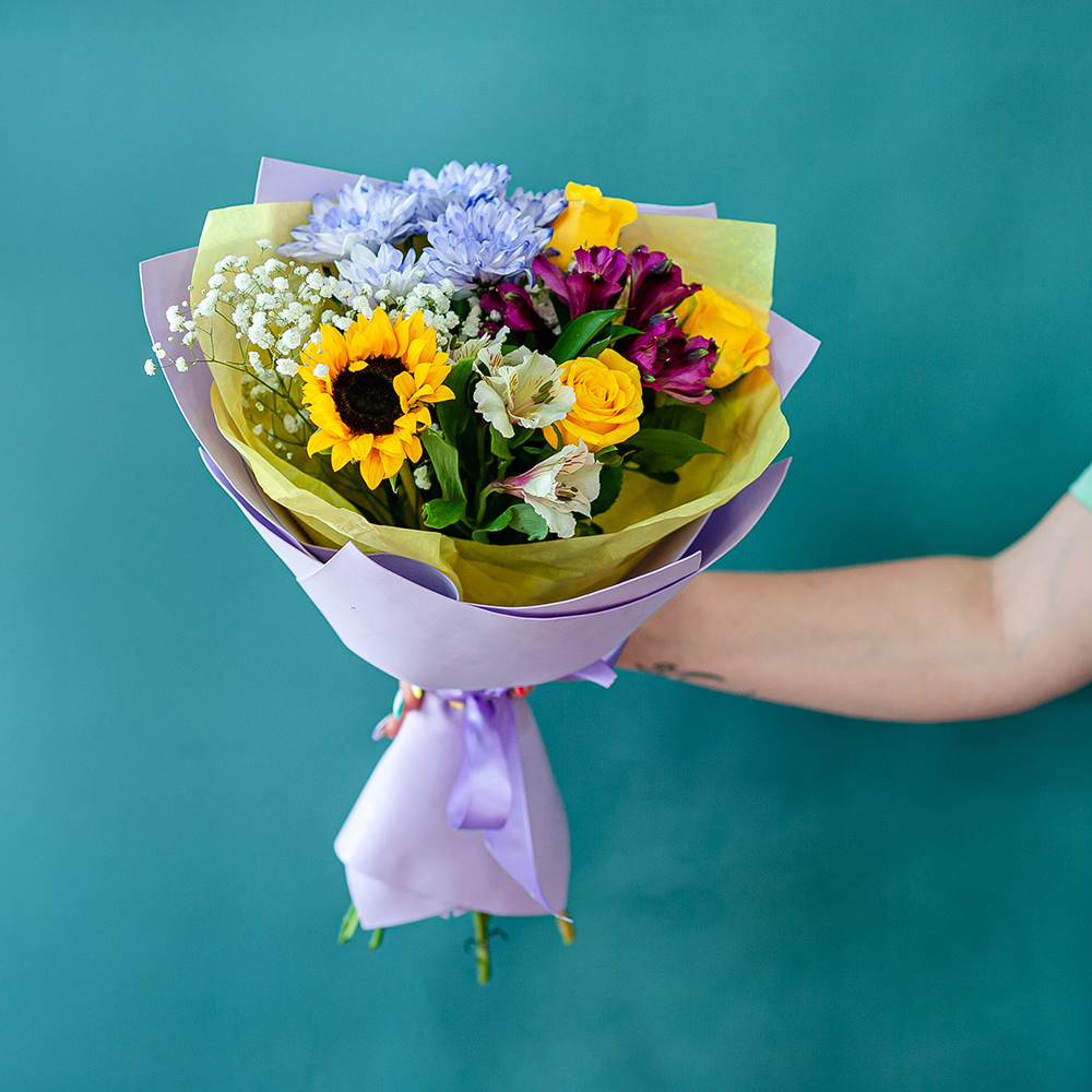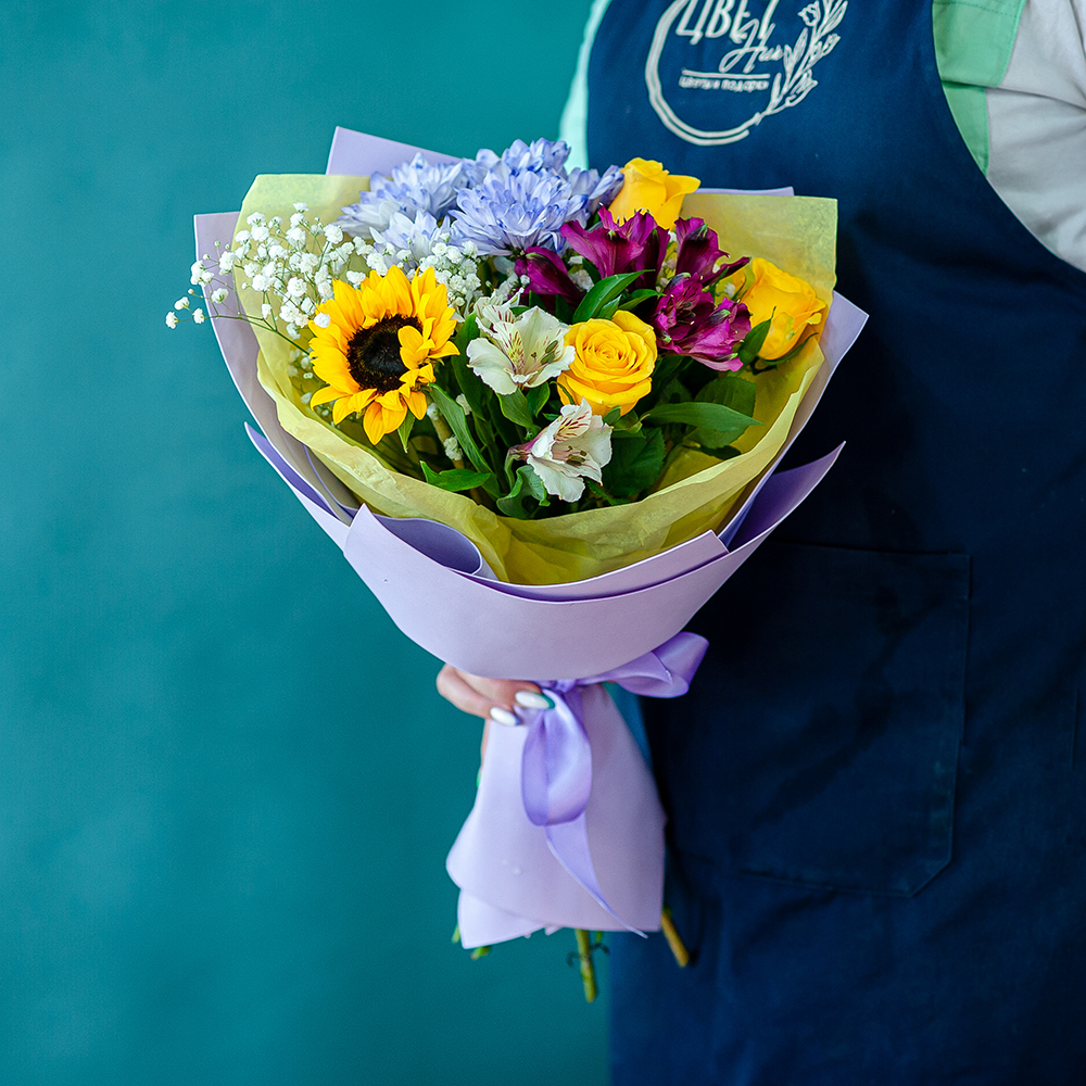Подсолнух символизирует счастье, оптимизм и энергию. Жёлтые розы добавляют букету яркости и элегантности. Сиреневое оформление делает композицию более изысканной и стильной. Этот букет станет отличным подарком на любой праздник или просто без повода, чтобы поднять настроение близкому человеку.