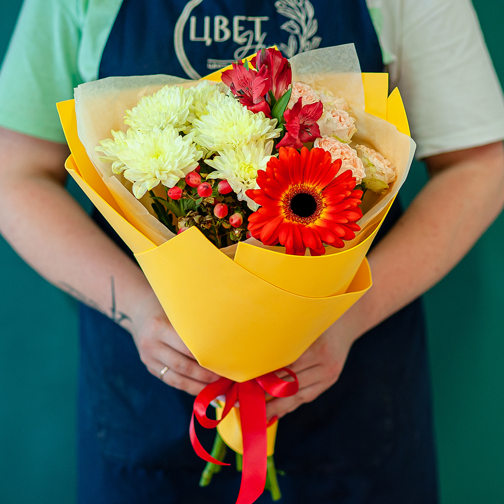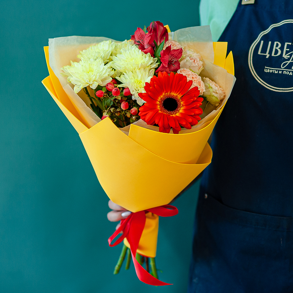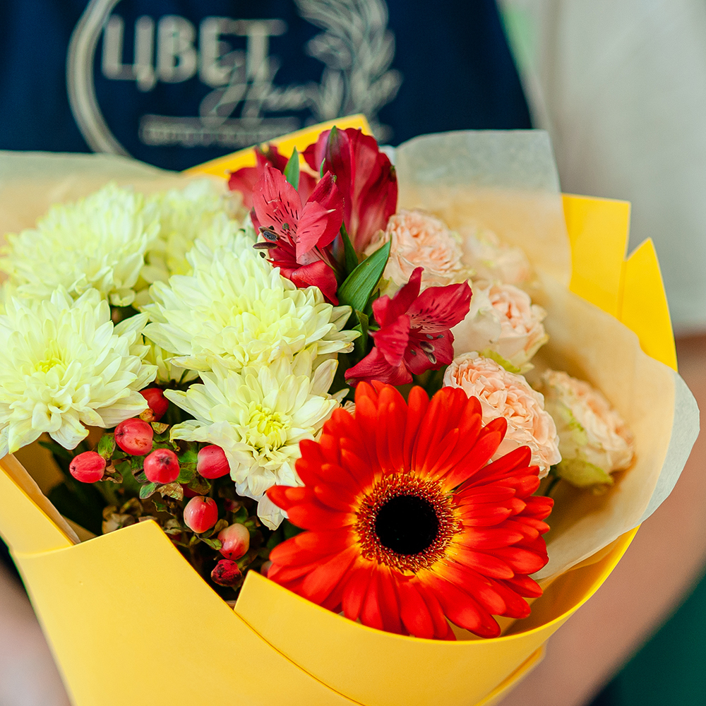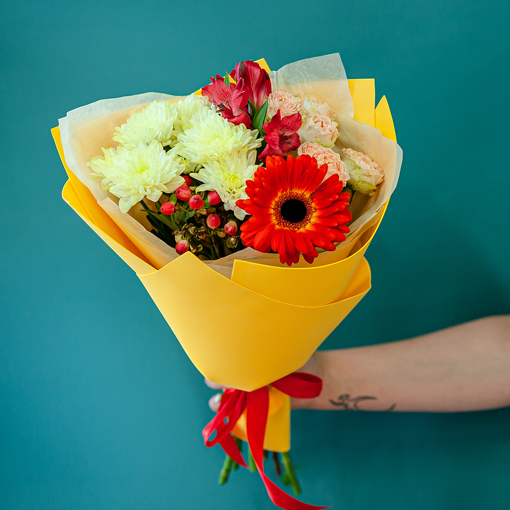 Жёлтые герберы символизируют счастье, оптимизм и энергию. Красные розы добавляют букету страсти и выразительности. Этот букет станет отличным подарком на любой праздник или просто без повода, чтобы поднять настроение близкому человеку.